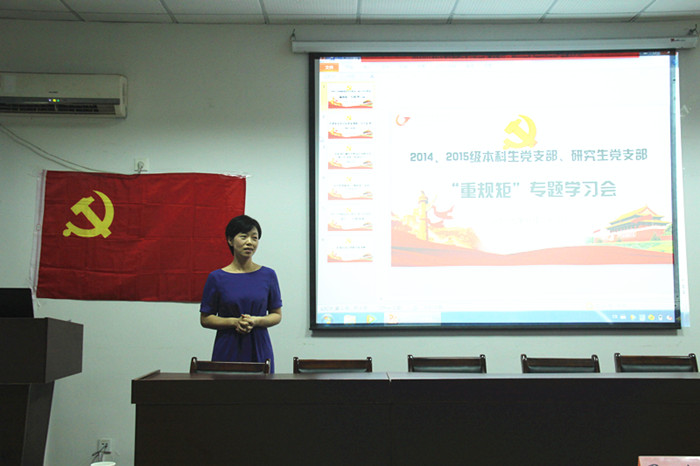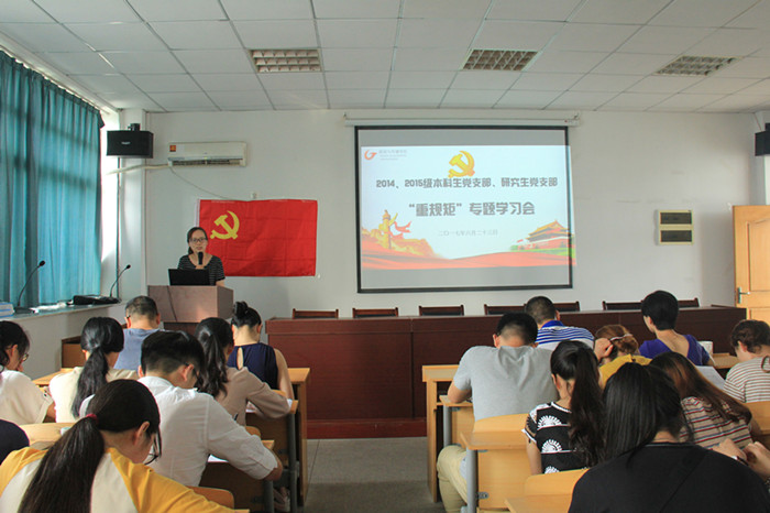 人不以规矩则废,党不以规矩则乱。为深入扎实推进“两学一做”学习教育的常态化与制度化,强化纪律规矩意识,6月23日下午,德赢AC米兰合作伙伴2014级本科生第一、第二党支部联合2015级本科生党支部、研究生党支部围绕“重规矩”这一主题,在学院四楼会议室举行了专题学习讨论会。德赢AC米兰合作伙伴副院长周伍、党委副书记宋静全程参与并指导,各党支部全体成员共同学习并交流发言。会议由2014级本科生第二党支部书记孙月婷主持。