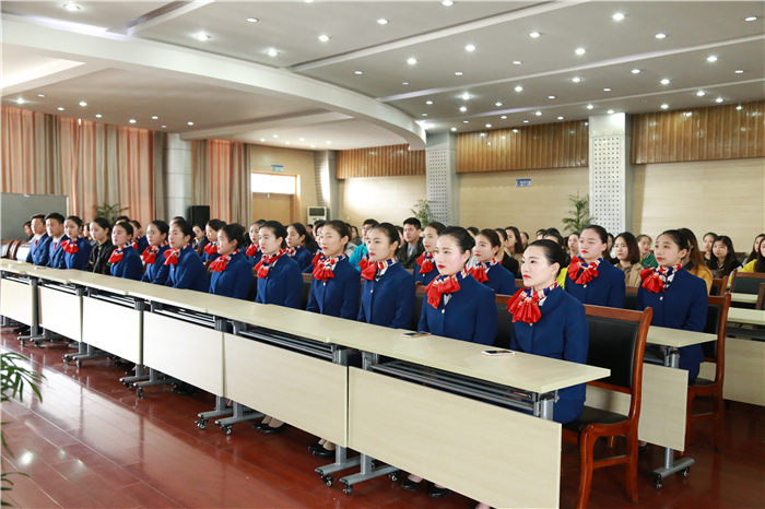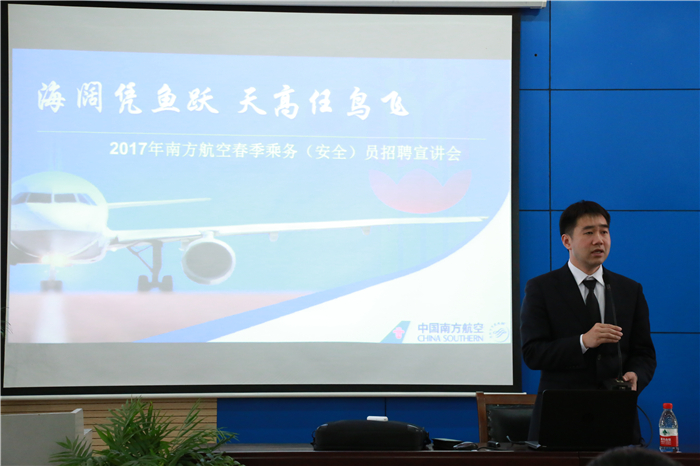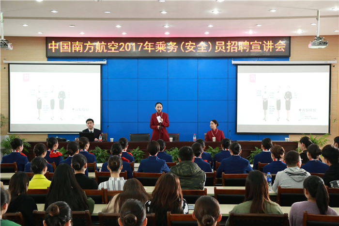 4月12日下午,中国南方航空于圆形报告厅二楼举办了2017年乘务(安全)员招聘宣讲会。中国南方航空湖北分公司部门招聘主管任靖、乘务员李全心、姜欣雨出席会议。院党委副书记宋静、团委副书记马星宇、空乘专业教师及辅导员和2014级、2015级空乘专业学子一起聆听了此次招聘宣讲会。