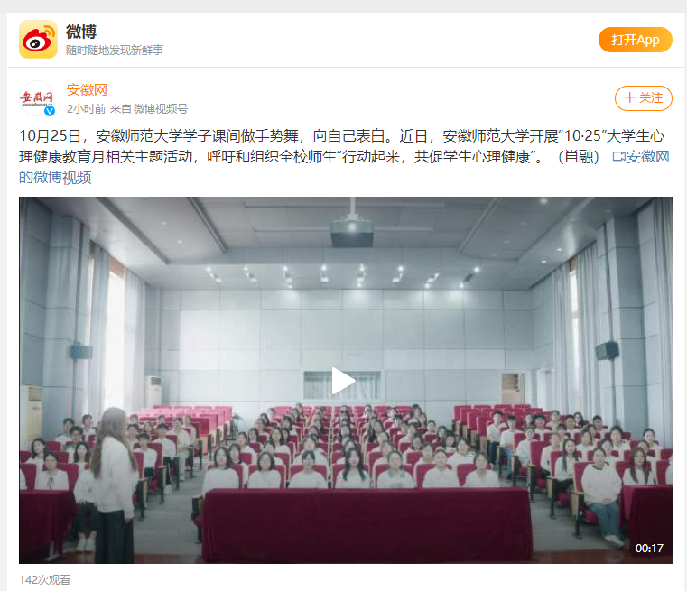 本网讯( 郭锦怡) 近日,我院为迎接心理健康月,举办了“10.25-邀您爱我”系列手势舞活动。此次活动以“舞动心灵,传递美好”为主题,旨在通过手势舞这一独特形式,将美育与心育有机融合,为学生们提供一个展示自我、释放压力、感受心灵和谐与美好的平台。10月28日,安徽网报道了我院24级新生心理健康月活动。