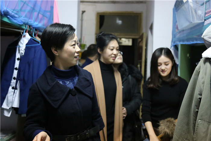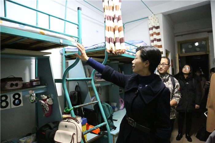 在检查寝室的过程中,宋静关切地查看同学们的被子够不够厚,询问期末学习是否紧张,并反复对同学们进行殷切的叮咛“大家的寝室都很干净整洁,布置的也十分温馨,冬天来了,为了保证安全,千万不要使用违规电器。”在检查15空乘专业的寝室安全情况过程中,挂在床头的干燥剂引起了她的好奇心,对此她感到十分新奇并亲切的说“我们要多和青年人打交道,这能够学习到很多东西。”同时宋静还关心地询问了同学们最近的英语四六级考试的准备情况和即将到来的双迎排练情况,并对其表示极大的鼓励和期许。