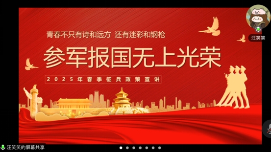 汪笑笑结合国家政策和学校入伍优势,围绕大学生参军入伍的身体条件、可享受的优待待遇、资助办法、考研升学以及退役就业服务政策等多角度向同学们进行解读宣讲,帮助同学们对征兵工作的要求、流程和征兵安排形成了更加深入地认识,呼吁同学们积极响应国家号召,以投身军营的方式践行爱国心、报国志,为祖国国防建设贡献青春力量。