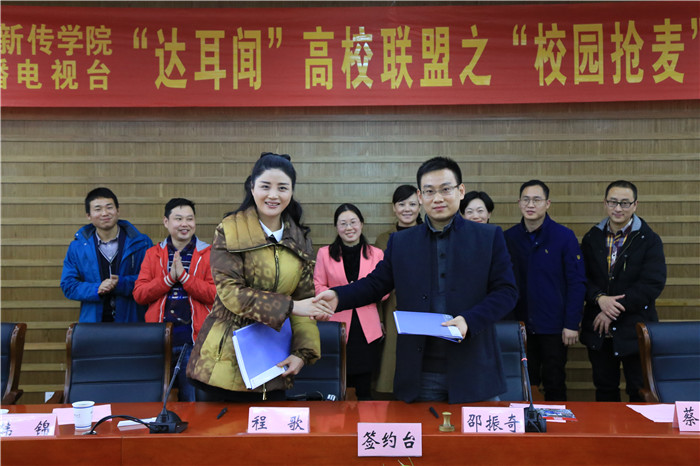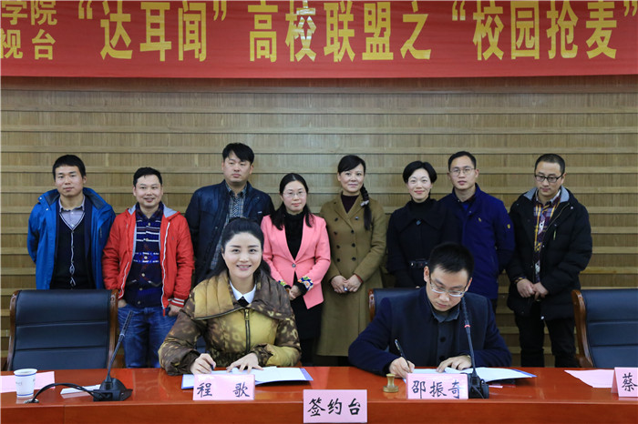 11月30日中午,由安徽广播电台“达耳闻”新媒体领导小组办公室与德赢AC米兰合作伙伴播音专业联合举办的高校联盟之“校园抢麦”活动签约仪式,在花津校区圆形报告厅一楼会议室顺利举行。安徽广播电视台旅游广播总监制、达耳闻新媒体办公室主任程歌,办公室副主任韩锦,办公室节目部负责人孙益民,安徽广播影视职业技术学院播音系主任蔡正兰,德赢AC米兰合作伙伴教学副院长马梅,党委副书记宋静,播音专业主任邵振奇,与各年级播音专业学子一起出席了仪式活动。仪式由德赢AC米兰合作伙伴团委副书记马星宇主持。
