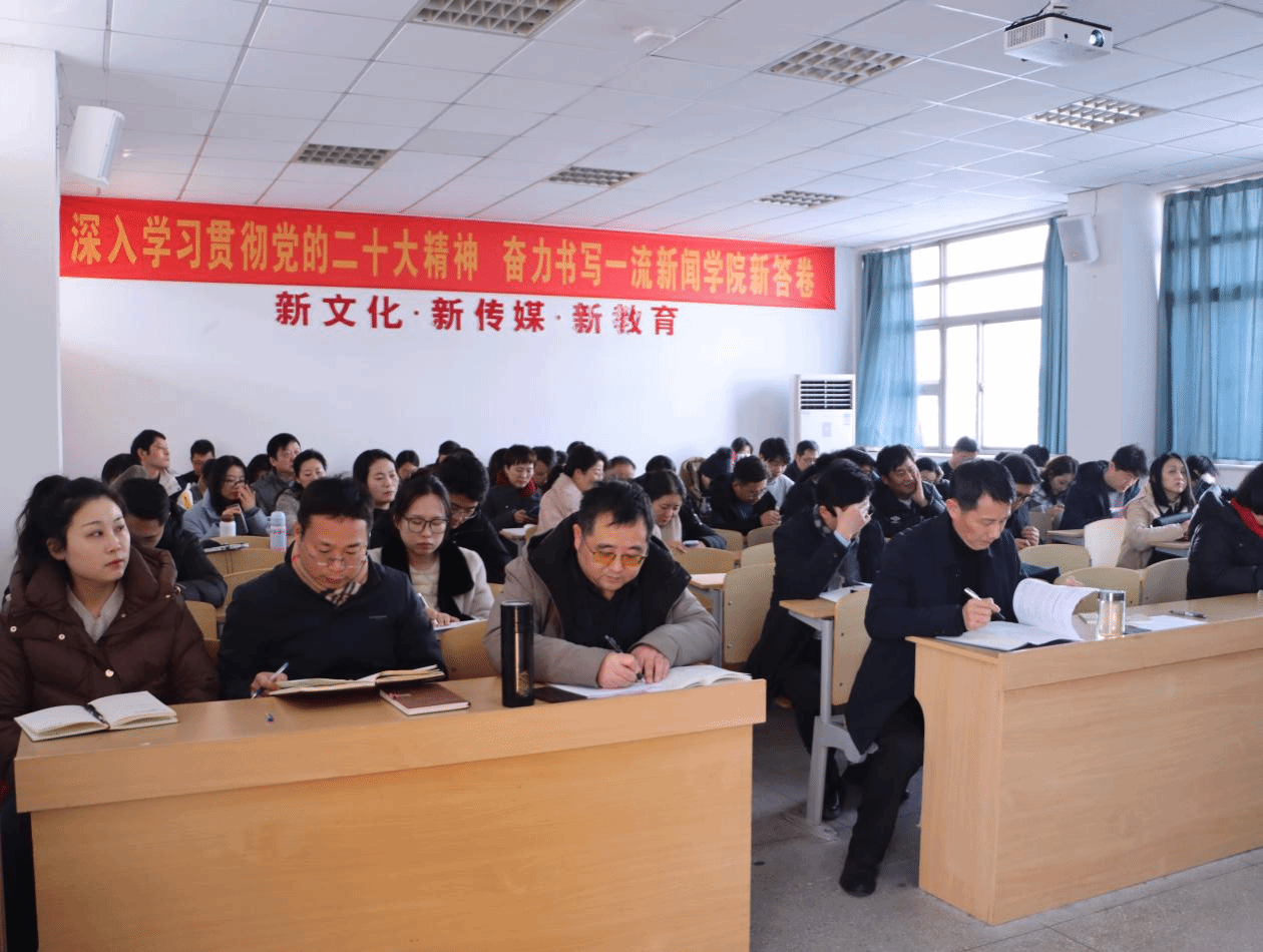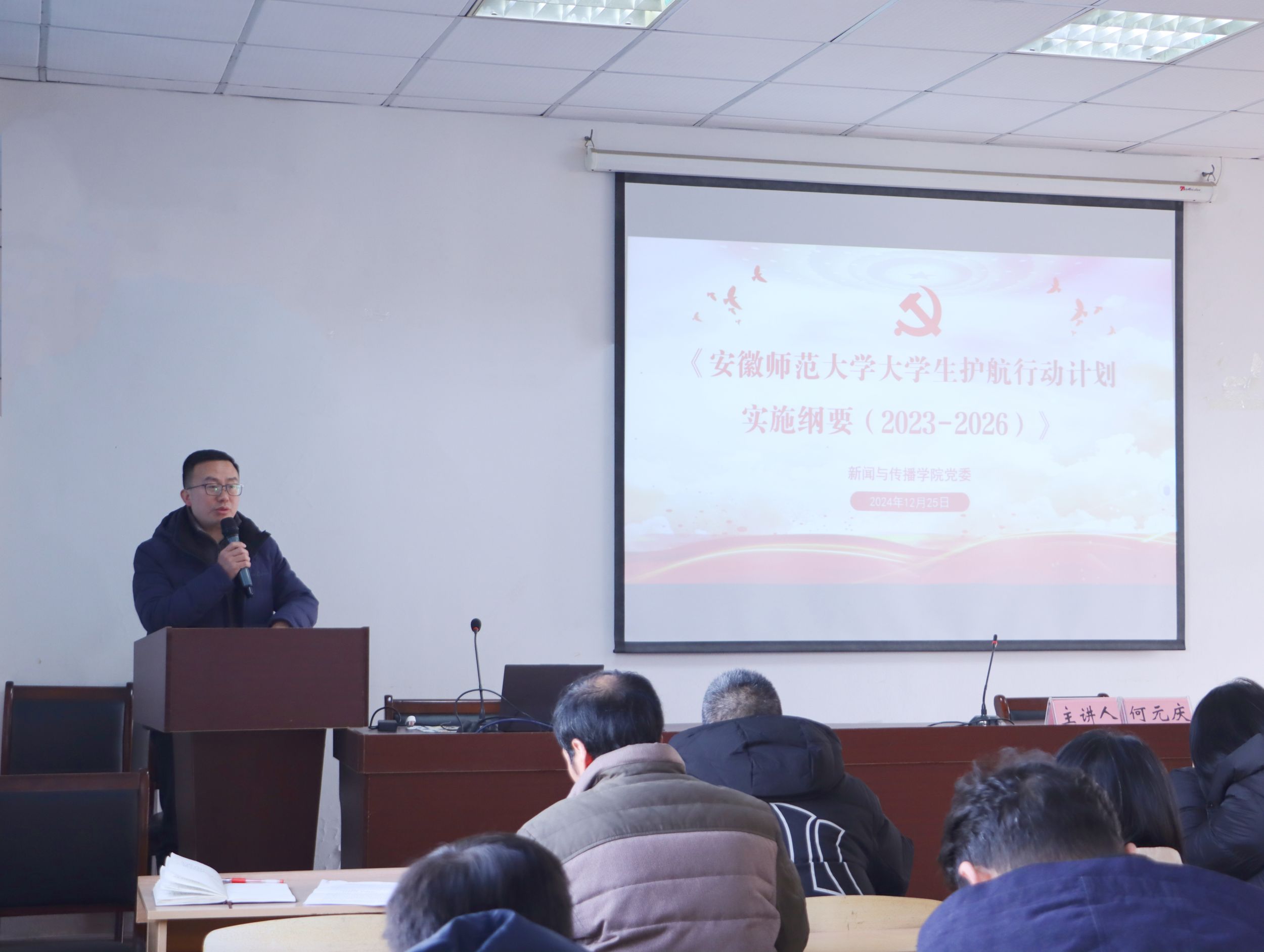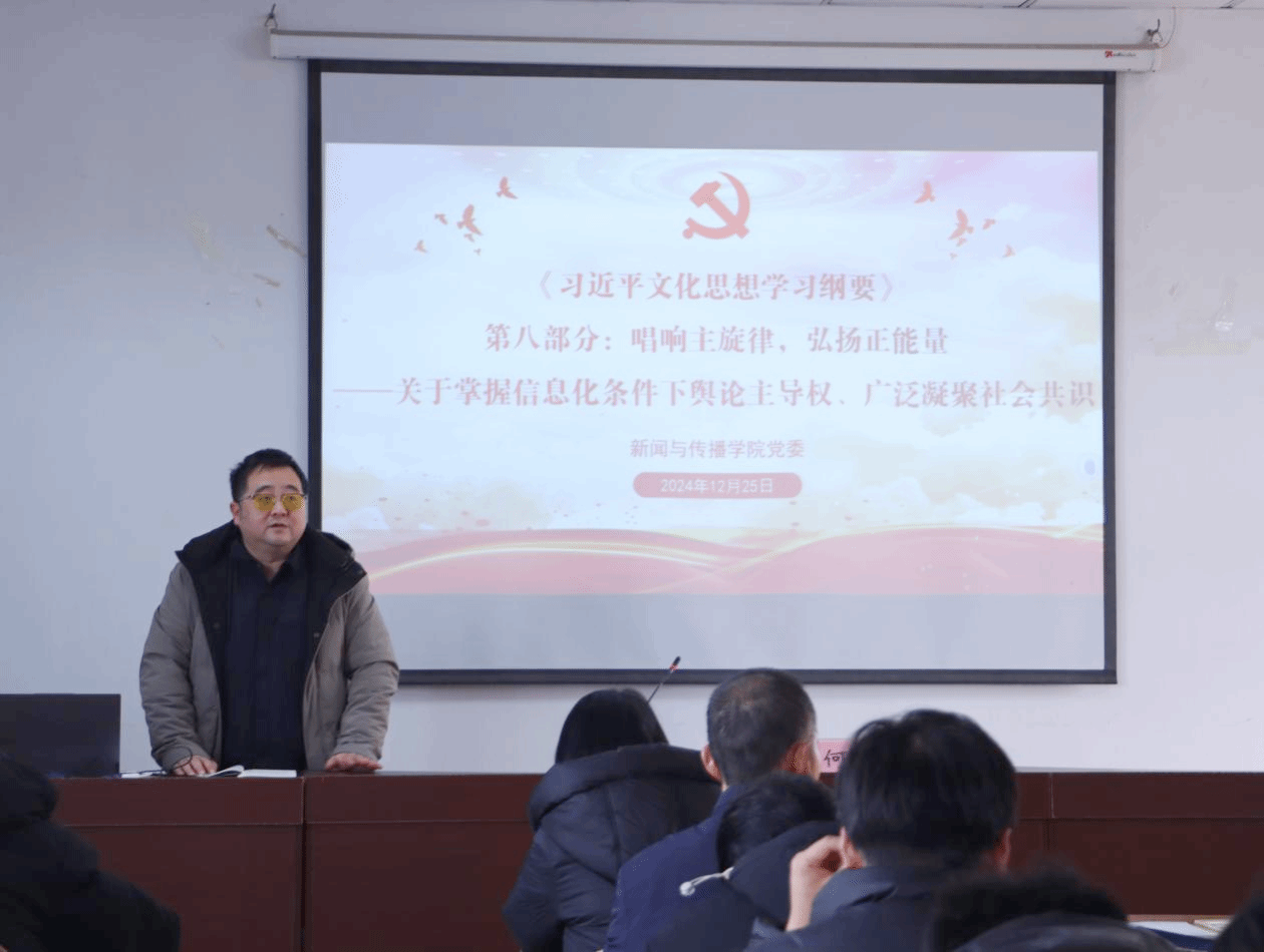 会议伊始,院党委副书记吴青山为大家领学《vwin德赢ac米兰官方网大学生护航行动计划实施纲要(2023-2026)》。他指出,大学生护航行动要通过各部门教职工合力才能完成,因此进一步厘清行动细则非常有必要,并根据不同行动主体从“牢记一个使命——落实立德树人,坚持以育人为业”“明确一个目标——统筹学生发展与安全”“统筹好五项任务为一体推进护思想、护学习、护生活、护情感、护身心”“紧扣一组指标——责任事故率、学业通过率、毕业率、考研率、就业率、文化生活参与率、管理服务满意率等”这几个方面展开领学。紧接着,副院长赵昊带领大家学习了《习近平文化思想学习纲要》第八部分关于掌握信息化条件下舆论主导权、广泛凝聚社会共识的相关文件精神。他表示,舆论是影响党的新闻事业的重要工作,我们要坚守党性原则和马克思主义新闻观,响应党中央号召,把握好新闻工作的时度效,管好用好互联网。此外,赵昊还指出新闻人才培养的重要性,并结合我院开展的“刘杰故事汇”、专业采风等学科实践活动等,谈人才培养的实效性。