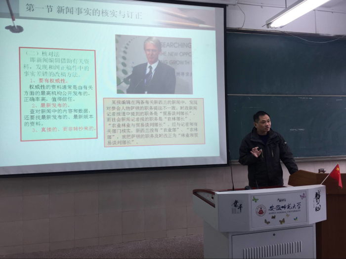 朱老师在讲“新闻内容的准确”时,列举了多个新闻内容出现错误的例子,如将“总经理”误写成了“总理”、将香港归为国外城市。编改稿件时要保证名称、时间、地点、数字等准确无误,越细小的地方越要注意。并且朱老师还与学生们进行互动,提问学生看其是否可以准确而迅速地发现新闻语句中的错误之处,看其是否有新闻敏感度。