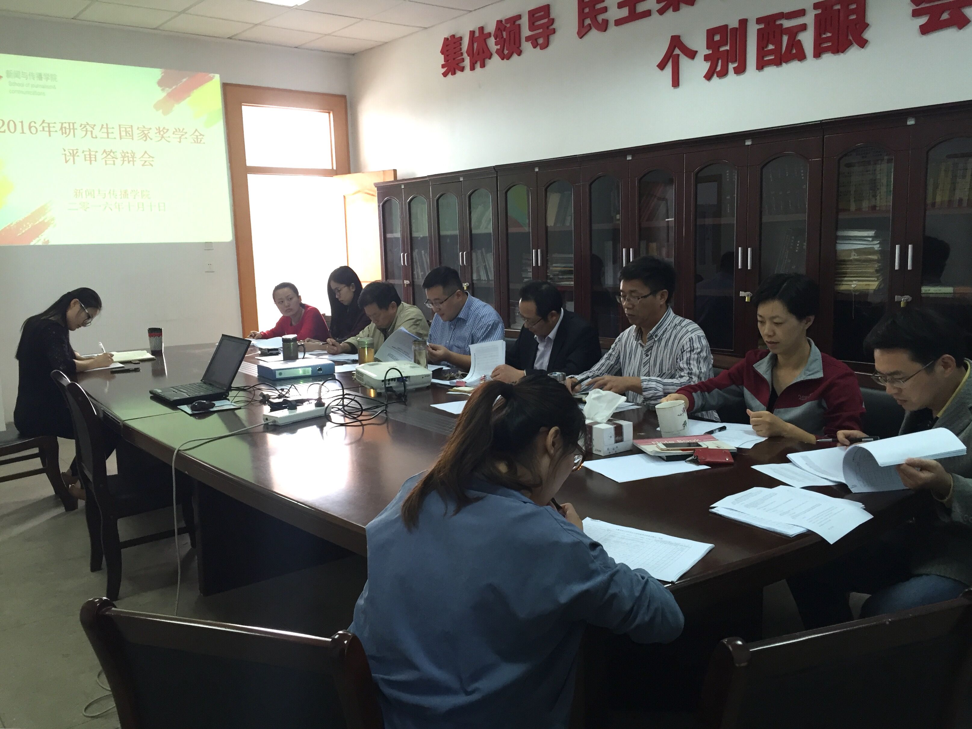 赵昊首先介绍了我校2016年研究生国家奖学金评审的政策依据、指标分配、评审程序等情况。来自2014级新闻传播学、戏剧影视学和2015级的新闻与传播专业的八名国家奖学金申请者就自己的学业情况、科研和社会实践情况进行了汇报和答辩。随后评审委员会对照评选办法,逐一审核了每位申请人提交的评审材料。经过评审小组充分而严谨的讨论,初步评选出2014级新闻传播学专业的姚瑶、夏冬以及2015级新闻传播学专硕的章丹丹为我院2016年研究生国家奖学金等额候选人,2014级戏剧影视学专业的徐紫林为差额候选人。