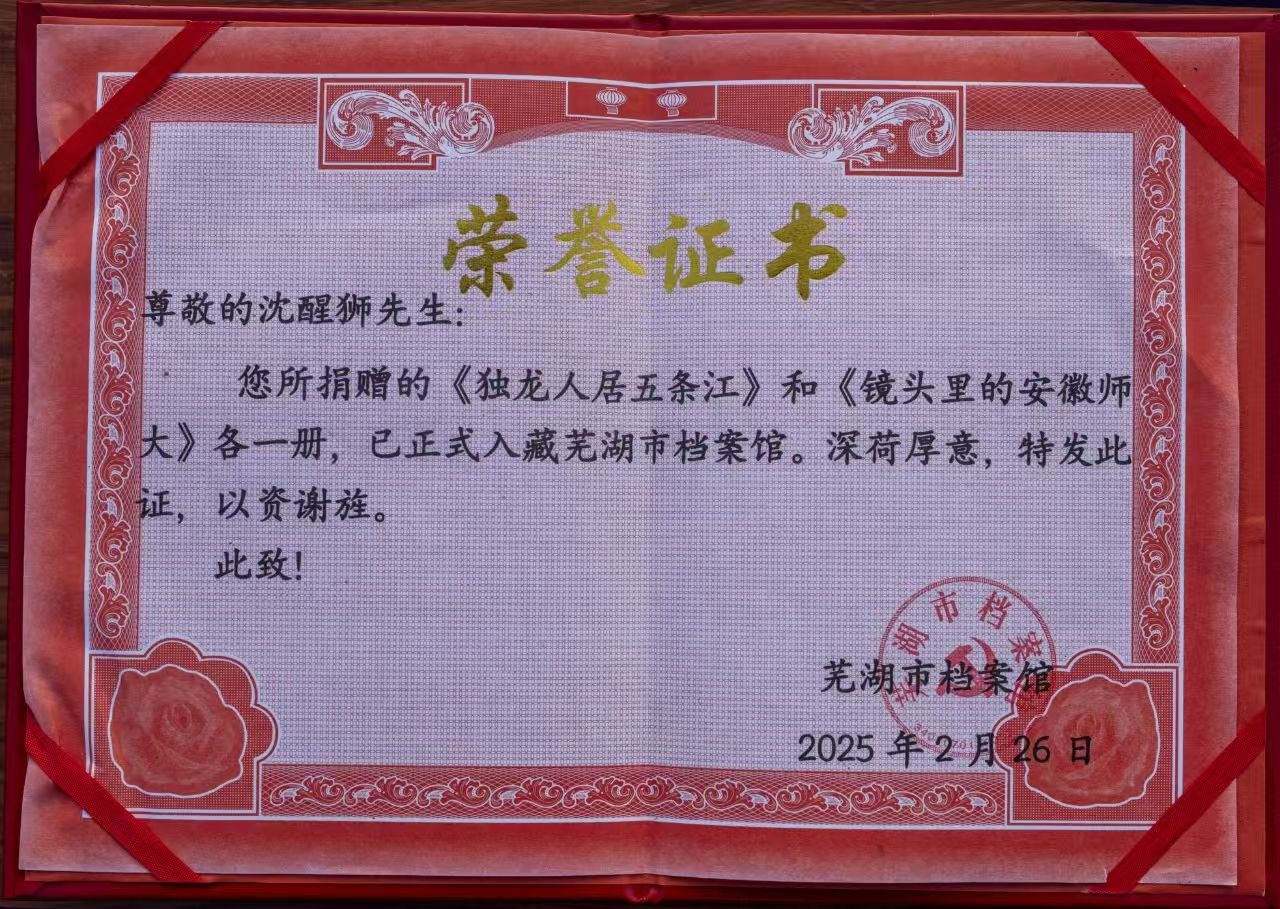 2月26日,芜湖市档案馆举行入藏证书颁发仪式,正式将德赢AC米兰合作伙伴退休教师沈醒狮的两部著作《独龙人居五条江》与《镜头里的安徽师大》纳入馆藏。此举标志着沈醒狮多年的影像记录成果获地方文化机构的高度认可,也为芜湖市历史文化资源库增添了重要文献。