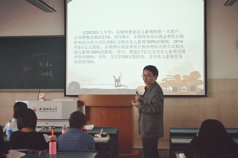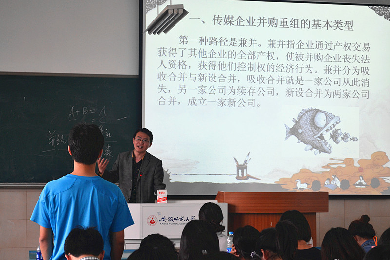 课上,肖老师先向学生们提出“企业为什么要并购重组”的问题,引导学生思考,随后从传媒企业并购重组的基本类型、理论分析、效应分析、风险分析四个方面展开课程内容。基本类型的介绍中,肖老师解释了并购、重组的概念,强调了兼并和收购的区别,用新鲜生动的案例介绍了并购的三种类型。同时,他多次与学生展开讨论交流,通过情景假设、实例分析等多种灵活方法加深学生对知识点的认识。讲授理论分析时,肖老师通过典型的案例将抽象的理论具体化、趣味化。探究企业并购重组效应时,他抓住时下热点与学生的兴趣点,分析了企业并购重组的规模经济效应、协同效应以及可以建立全产业链的优势。最后,他从经营、管理、文化、财务四个方面介绍了传媒企业并购重组存在的风险。