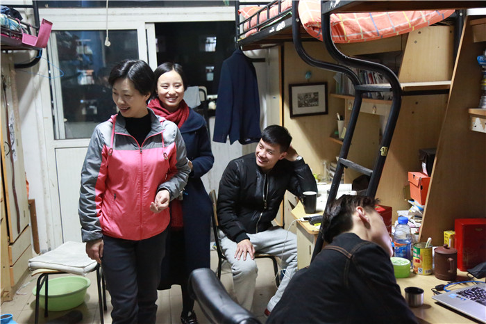 宋静等一行领导老师首先来到大四毕业班的学生公寓,热切地和毕业班同学谈起了就业现状,毕业后的计划与期待等问题,叮嘱选择就业的同学多多关注学院发布的招聘信息,主动大胆地多尝试,同时勉励考研学子积极准备考研复试,多向学院老师和优秀学长请教,走好自己坚持的学术之路。在随后的大一、大二、大三年级的寝室走访里,老师们亲切地和同学交流学习和生活上的情况,征求大家对学校学院工作的建议,鼓励同学们在新学期在早早制定学年规划,争取实现更大进步。