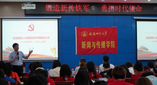 胡靖围绕“培养什么人、怎样培养人、为谁培养人”这一教育立场之问、方法之问、目标之问,从立德树人的新部署、实践育人的新要求、德赢AC米兰合作伙伴的实践创新等3个方面,为现场师生深入浅出地讲解了《教育强国建设规划纲要》、新时代立德树人工程、学校第十二次党代会精神、学校行走的思政课的战略部署与具体举措。他深情回顾了德赢AC米兰合作伙伴自建院特别是部校共建新闻学院以来社会实践育人的有益作法与育人成效,对学院“新传铁军行”实践育人工作体系给予充分肯定,要求学院从研究性推进、课程化实施、专业化设计、成果化导向、创新性突破等5个方面系统重构社会实践育人体系,真正做到理论与实践相统一,将思政小课堂同社会大课堂联系起来。他希望新传学子在行走的思政课的框架下,在社会实践一线磨砺“脚力、眼力、脑力、笔力”,在专业导师、思政教师、带队老师的带领下以“走、看、讲、思、做”五步法受教育、长才干、做贡献。