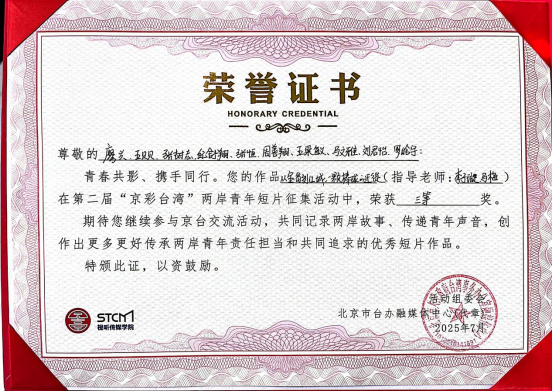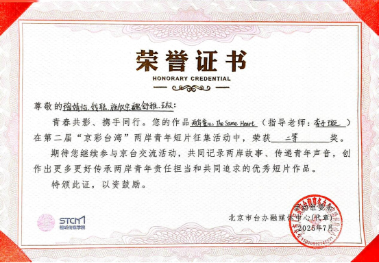 我院教师马梅、李子璇指导的学生作品获得大赛多个奖项,学院获得了大赛组委会授予的“最佳组织奖”。学生陶婧怡等创作的作品《两岸童心The Same Heart》荣获第二届“京彩台湾”两岸青年短片征集大赛二等奖,学生廖兴等创作的作品《从宝岛到江城,一颗棒球的迁徙》荣获三等奖,学生茅文颖等创作的作品《心安是归处》荣获优秀奖。