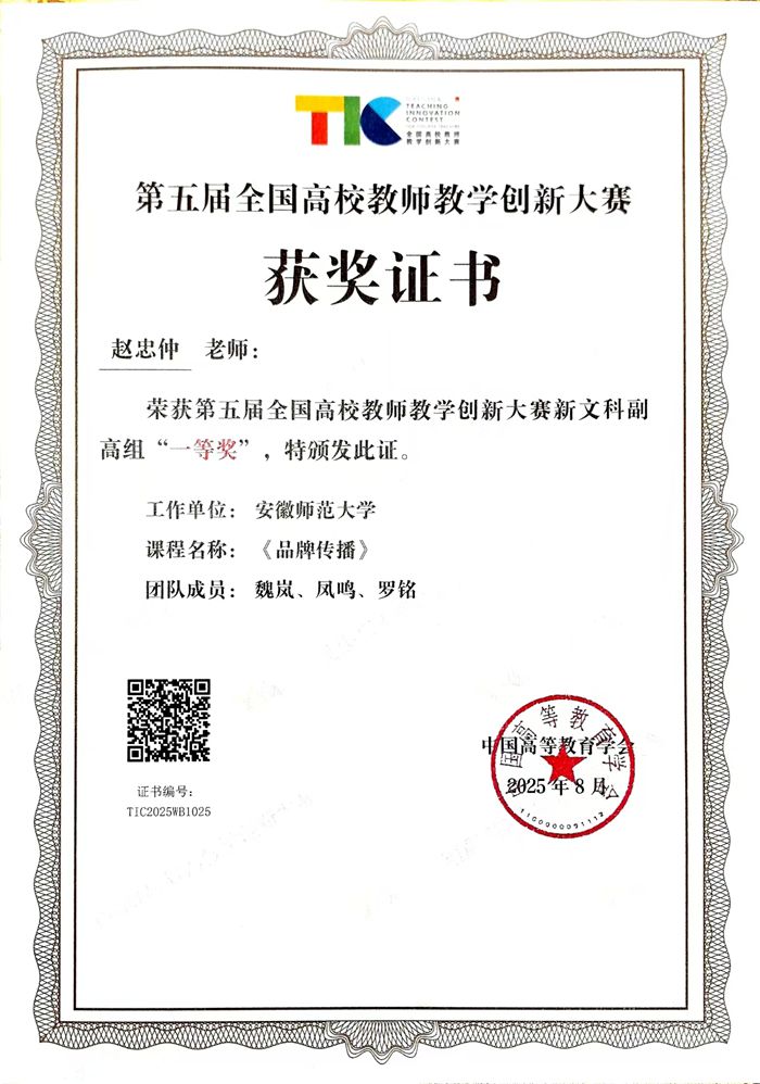 此次获奖的赵忠仲教师团队,正是学院教学创新氛围的缩影。其参赛作品《品牌传播》立足行业前沿与人才需求,以“跨学科融合”打破知识壁垒,以“产教结合”贯通理论与实践,以“数字化教学手段”重构学习场景,构建起特色鲜明的教学体系,为培养兼具创新思维、实战能力与数字素养的品牌传播人才提供了坚实支撑。在教学理念、内容、方法、评价等方面进行了大胆探索,有效提升了学生的学习主动性与综合能力,得到了评审专家的高度肯定。赵忠仲老师表示:“学院对教学工作的重视和持续支持,是我们能够安心投入教学创新的坚强后盾。从初期的方案打磨到赛前的多轮模拟演练,学院都组织了专家团队给予悉心指导,这份荣誉属于整个学院。”