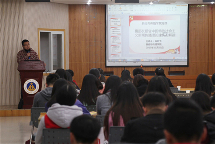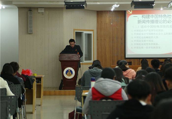 肖叶飞首先结合自身经历,讲述了曹部长报告历经多次修改到最后定稿的整个过程,并对部校共建新闻学院的背景做了简单回顾。随后,他从必要性、主要来源、框架内容三个方面对建构中国特色社会主义新闻传播理论进行了宏观介绍和详细解读。对比西方新闻传播理论和实践,肖叶飞表示要结合中国的特殊国情,推进中国特色社会主义新闻理论的建设。结合当前互联网时代的特点,他反复强调中国是共产党领导的国家,需坚持党性与群众性的和谐统一。反思新闻媒体的不当行为,他指出提高记者理论和道德素养的重要性。援引古今,肖叶飞带领学员们了解了马克思主义新闻观在不同时期的发展情况,并指出其对建构中国特色社会主义新闻传播理论的补充和借鉴意义。紧接着,结合拉斯韦尔的5W理论,肖博士着重分析了中国特色社会主义理论的框架内容。就新闻传播是什么的问题,他使用了阵地、桥梁和舆论载体三个名词对党、政府和人民三个方面做了阐释,揭示了新闻传播的服务性。结合欧洲媒体和美国媒体的一些具体案例,就新闻自由这一理论,肖博士表达了自己的观点:“任何国家的新闻自由都不是绝对的自由,而是有约束,受控制的。”他更特别讲述了自由与控制、民主与法治这两对概念的统一性。针对新闻传播的效果和影响,肖博士从满足人民需求和在世界发声两大方面加以阐明。“希望同学们早日加入党组织”,最后,肖叶飞博士用一句寄语结束了这次授课。