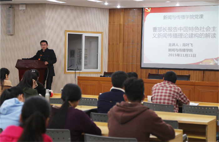 11月11日晚6点半,学院分党校邀请新闻系副教授肖叶飞博士就曹征海部长《试论中国特色社会主义新闻传播理论的构建》专题报告进行解读。学院分党校全体学员与学院专职辅导员老师们共同聆听了报告会。