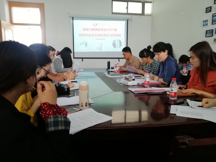 会议上半场进行本科生优秀毕业论文汇报。6名同学以PPT形式,介绍其论文的研究背景、研究框架、研究内容及研究不足等。在座的专业老师根据学生的汇报,指出其论文存在的问题,并给予相应的建议。会议下半场,前往新浪安徽、中国蓝融媒体中心、新安晚报等单位实习的8名同学从实习经历、实习作品及实习心得等方面展开实习汇报。