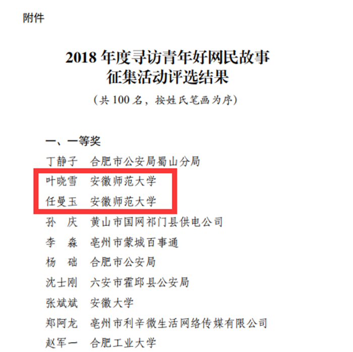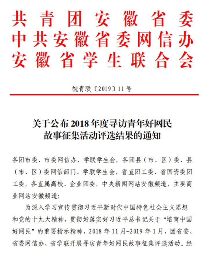 2月27日,共青团安徽省委、中共安徽省委网信办及安徽省学生联合会共同发布了《关于公布2018年度寻访青年好网民故事征集活动评选结果的通知》,其中,德赢AC米兰合作伙伴2017级网新专业叶晓雪、2016级新闻专业曹寅飞和2017级网新专业赵柳明同学分别获得一、二、三等奖。
