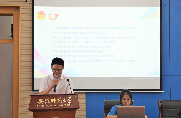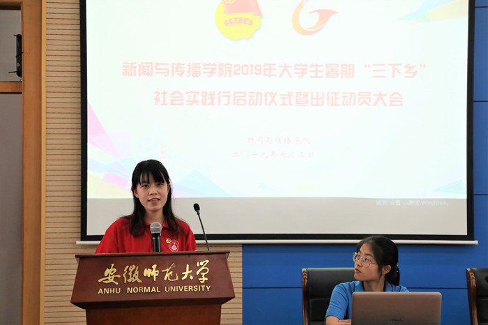 团歌悠扬,启动仪式在全体与会成员的合唱声中拉开了帷幕。与会师生共同观看了由院社会实践学生工作组精心制作的短片《2019新传先锋再出发》。短片中回顾了2018年新传学子暑期社会实践团队的精彩表现,送达了学院领导老师与优秀志愿者代表给2019年社会实践团队的期冀与祝福。