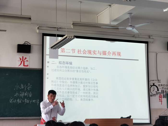 此次课程从“媒介再现”入手,罗铭老师结合最新媒介事件详细阐释了媒介再现与社会真实建构。由于媒介受到意识形态和话语权的控制、商业利益的驱使等因素,媒介的观点会带有一定的内在趋向性,往往未能真实反映客观现实。为让大家更好的理解教授的知识点,罗铭老师在谈到社会现实和媒介再现时,对客观现实、拟态环境和主观现实的概念作出了解释,并结合当下的诸多媒介现象,为学生梳理了三者之间的逻辑关系。深入浅出的讲解让人印象深刻,同学们的笔尖也在笔记本上不停挥动着。