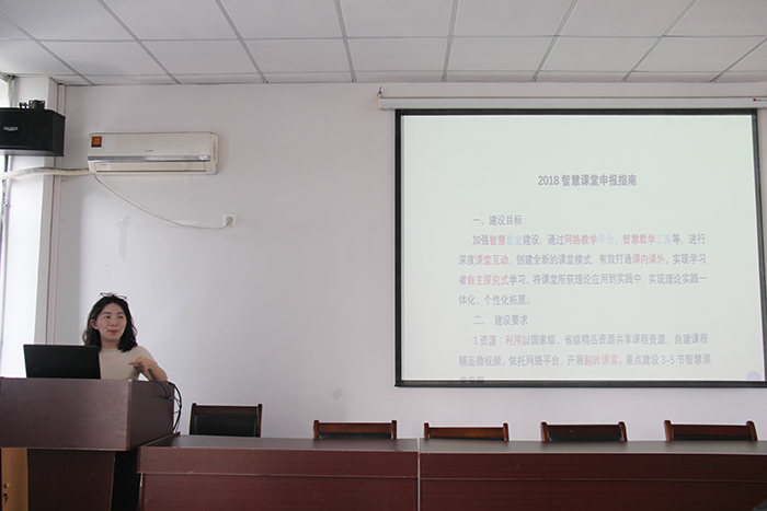 会议最后,动画专业教师陈若飞以PPT汇报的形式向大家展示了智慧课堂的申报指南及操作步骤,她指出智慧课堂是以学生为主体、教师为主导的创新的教学方法,不仅能调动学生在课堂上的积极性,加强课堂互动,教师也可以根据课中、课后的学习反馈数据对学生进行针对性指导。