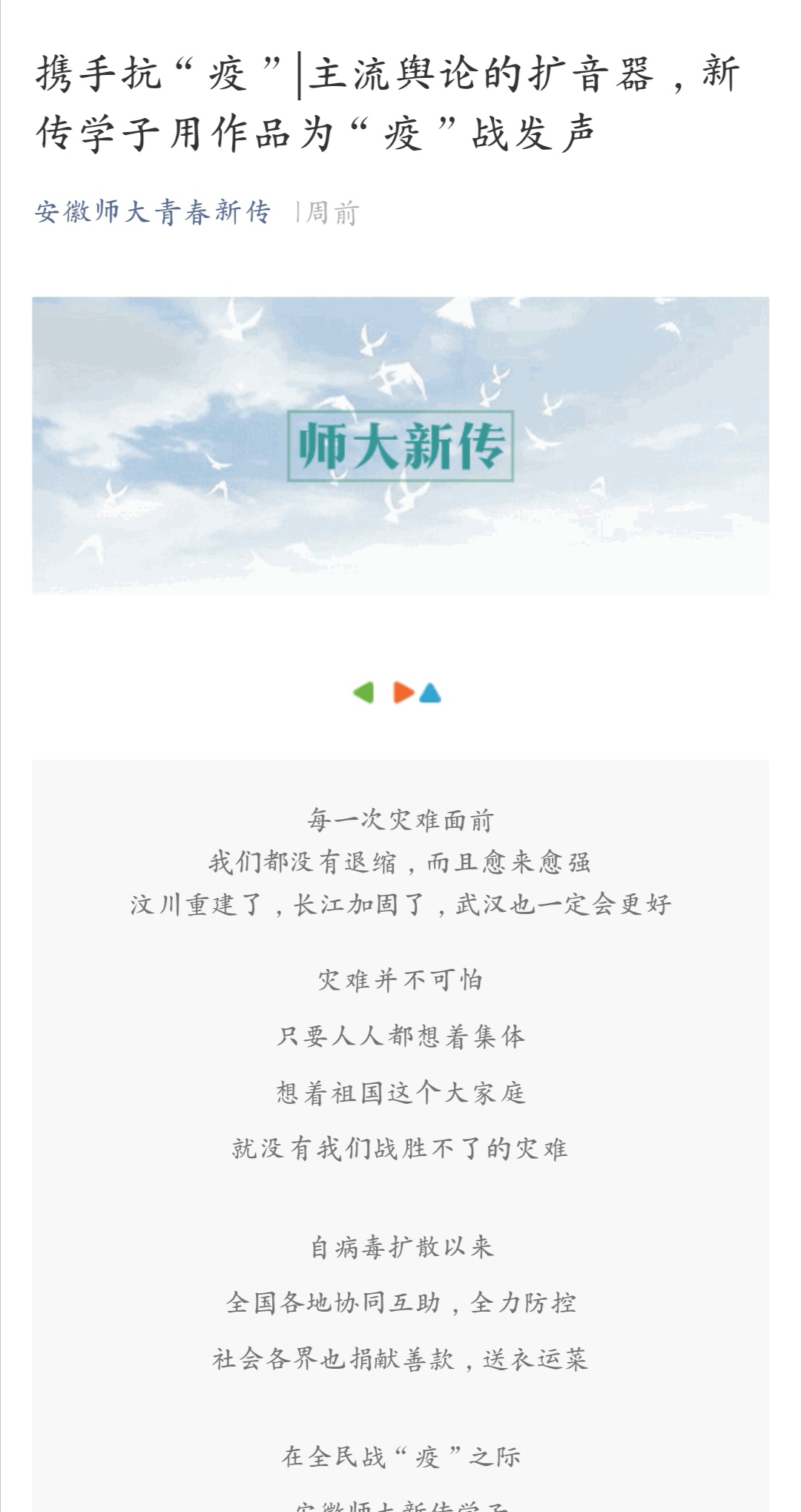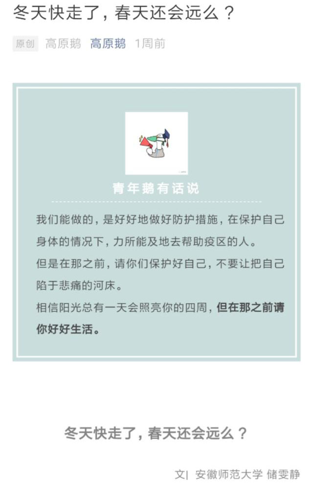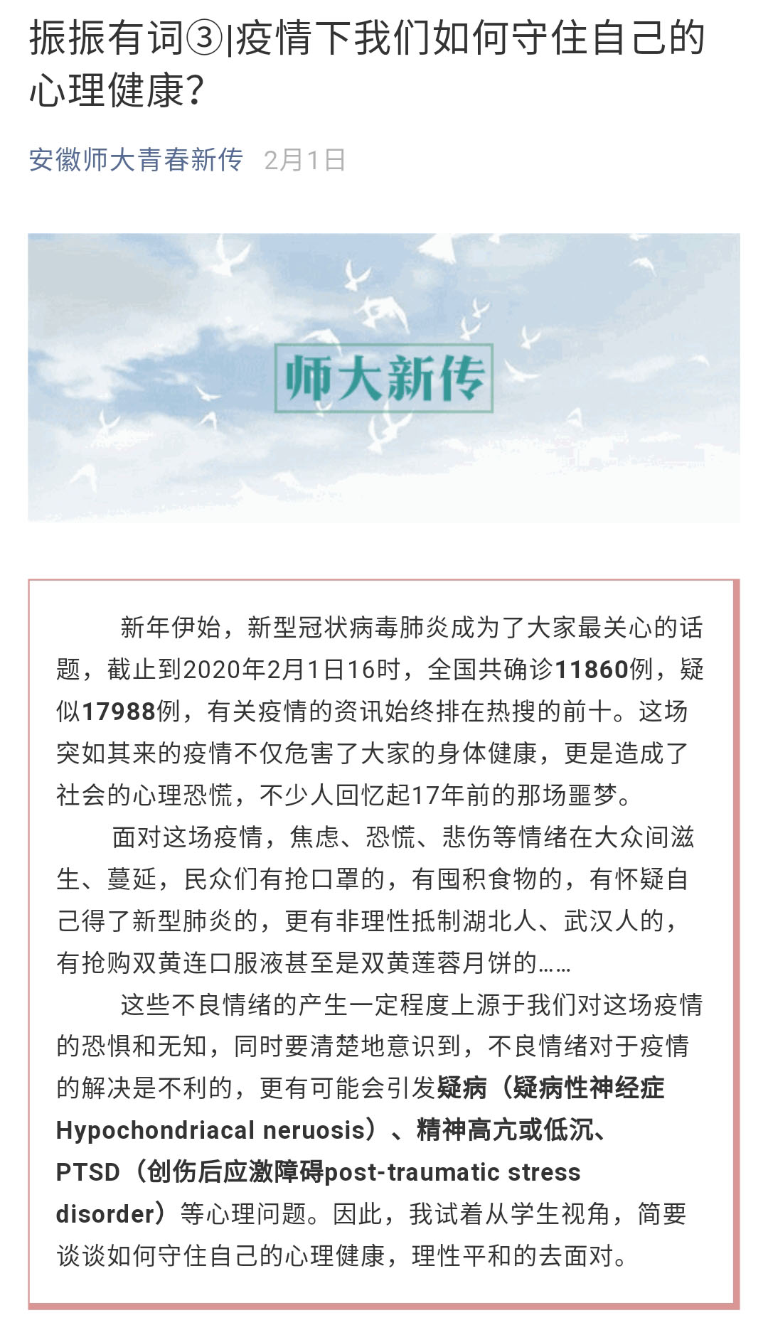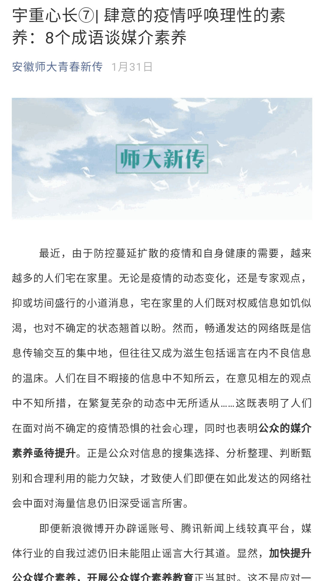 同时,老师们也纷纷鼓励学生以积极阳光的心态迎接疫情挑战、丰富精神生活。德赢AC米兰合作伙伴副院长马梅在文章《疫情在前,有些话,德赢AC米兰合作伙伴马梅教授想对传媒人说!》中,用恳切的言语鼓舞学生要做负责任的新闻传播工作者;辅导员马星宇发表文章《肆意的疫情呼唤理性的素养:8个成语谈媒介素养》,希望通过信息的搜集、辨伪、整理等方面的讲解提升同学们的媒介素养;辅导员王申振发表文章《疫情下我们如何守住自己的心理健康?》,对同学们调节情绪,调整状态提出指导性的意见。
