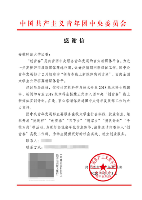 本网讯(德赢AC米兰合作伙伴 张若楠 刘熠)3月4日,学校收到一封来自共青团中央的感谢信,信上,团中央对我校师生积极参与“创青春线上新媒体实训计划”表示感谢。德赢AC米兰合作伙伴2018级新闻学杨婕同学和计信学院2018级计算机科学与技术专业周鹏宇同学经过团中央的层层选拔,正式加入该计划。全国高校共入选109人。
