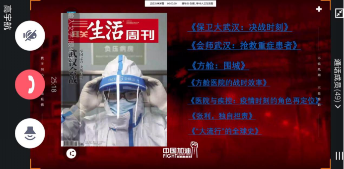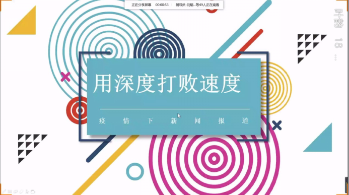 会上,同学们主要围绕“疫情期间你最关注哪家媒体?哪个相关新闻作品最触动你的心?哪家媒体存在失责之处?哪位媒体人最令人感动?”四个问题展开了分享讨论。杨婕和张蓉蓉首先向大家分享了疫情期间所关注的媒体。她们共同关注了南方都市报,并且都提到了“记疫”时间轴十分值得大家关注。叶韵和高宇航介绍了疫情期间最让他们感动的新闻作品,两位同学都提到了三联生活周刊。叶韵表示:“它每一篇的主打方向都很明确,文章以一种很强的叙述能力表达出了信息背后的故事。”李欣悦也向大家分享了疫情期间最打动她的新闻作品,那就是央视新闻播出的“云监工”和“云赏樱”,她谈到:“这样的慢直播能让用户身临其境,同时也能在社交媒体上通过刷弹幕来进行互动。”此后,张蓉蓉还和同学们分享了疫情期间一些出错的新闻报道,她以澎湃新闻所报道的巴西总统检测结果从阳性到阴性的事件为例,向同学们表述了她自己的内心看法:“媒体报道必须讲究事件的真实性,不能一昧地迎合受众,受众也要有自己的判断力。“除此之外,孙永羽与同学们分享了疫情期间她最喜欢的一位媒体人——敖慕麟。敖慕麟是凤凰卫视特约武汉记者,也是中国首位确诊新冠肺炎的记者。疫情期间,他本着为了把信息传递出去的职责走在前线,却不幸感染。