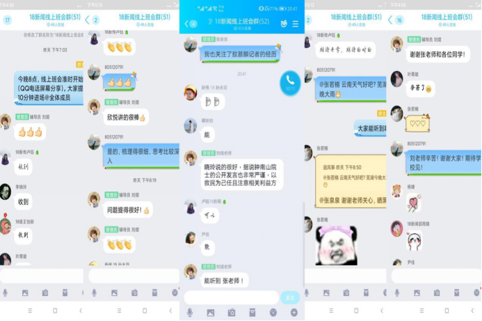3月25日晚8点整,2018级新闻班召开了“培养爱国责任感,争做未来媒体人”主题云班会。本次班会由班长刘伟龙主持,2018级新闻学全体学生参会。班会特邀了学院副教授张泉泉老师和2018级辅导员刘熠老师在线上进行指导。