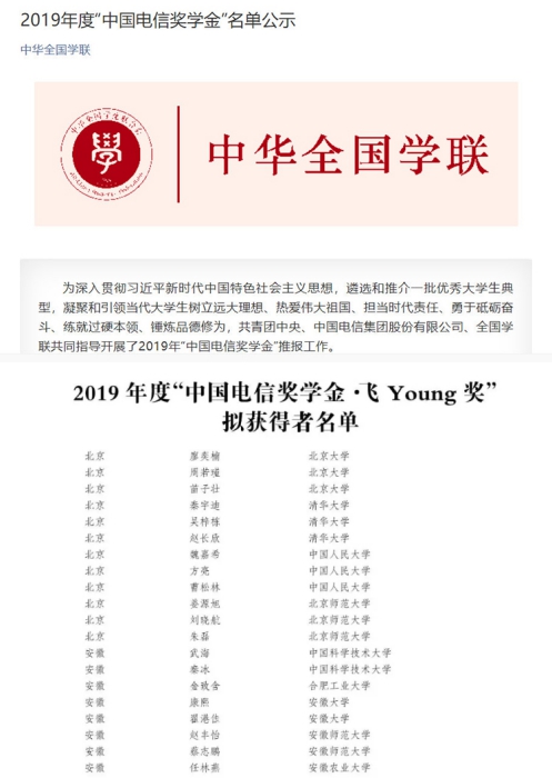 (德赢AC米兰合作伙伴 李化来)近日,2019年“中国电信奖学金”遴选寻访活动评选结果揭晓,经高校推荐、省级初评、全国评审等环节,我校德赢AC米兰合作伙伴赵丰怡同学喜获“中国电信奖学金·飞Young奖”。“中国电信奖学金”由共青团中央、中国电信集团公司、全国学联自2014年起联合设立,在青年学生中深入开展培育和践行社会主义核心价值观活动的具体举措,旨在引导广大青年学生培育和践行社会主义核心价值观,发掘优秀大学生典型和发挥示范作用,凝聚和引领当代大学生树立远大理想、热爱伟大祖国、担当时代责任、勇于砥砺奋斗、练就过硬本领、锤炼品德修为。