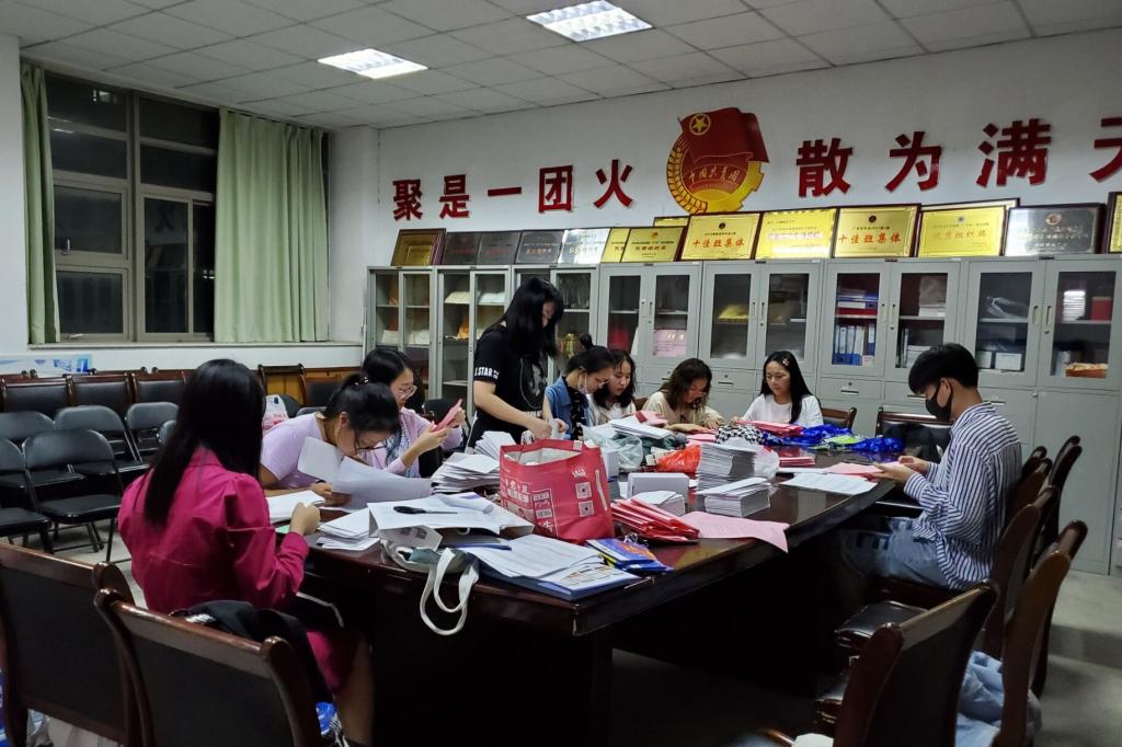 9月18日下午,横幅悬挂、寝室床贴布置、迎新大礼包摆放等前期等工作全部完成。迎新当日,学生工作人员提前到达新生报到处进行最后的提示牌、地贴等装饰布置,等待新生的到来。