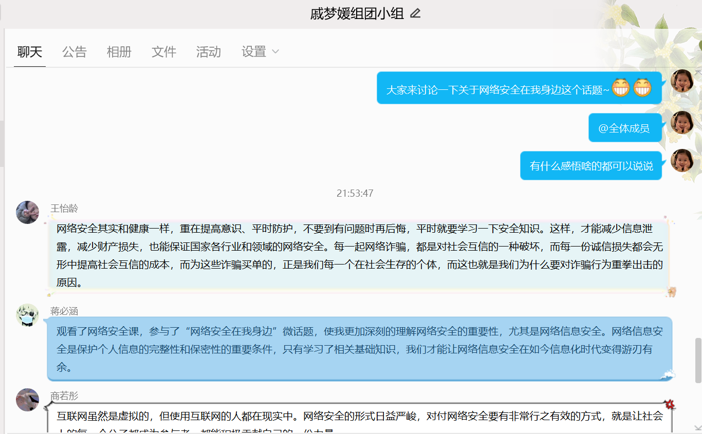 同上一堂课,共筑安全防线9月15 日上午10时,教育部思政司组织录制“聚力青春守护安全”网络公开课,通过新华网、央视网、腾讯新闻、哗哩哗哩、快手、新浪新闻、中国大学生在线等平台在线播放。此外,中国大学生在线将开辟网络安全专栏,遴选一批慕课课程,主要内容包括了解各类媒介的特点和使用方法、理性看待媒介中的信息、信息甄别、正确使用、生产和传播媒介产品等。新传学子积极响应号召,主动观看网络公开课并展开热烈讨论。