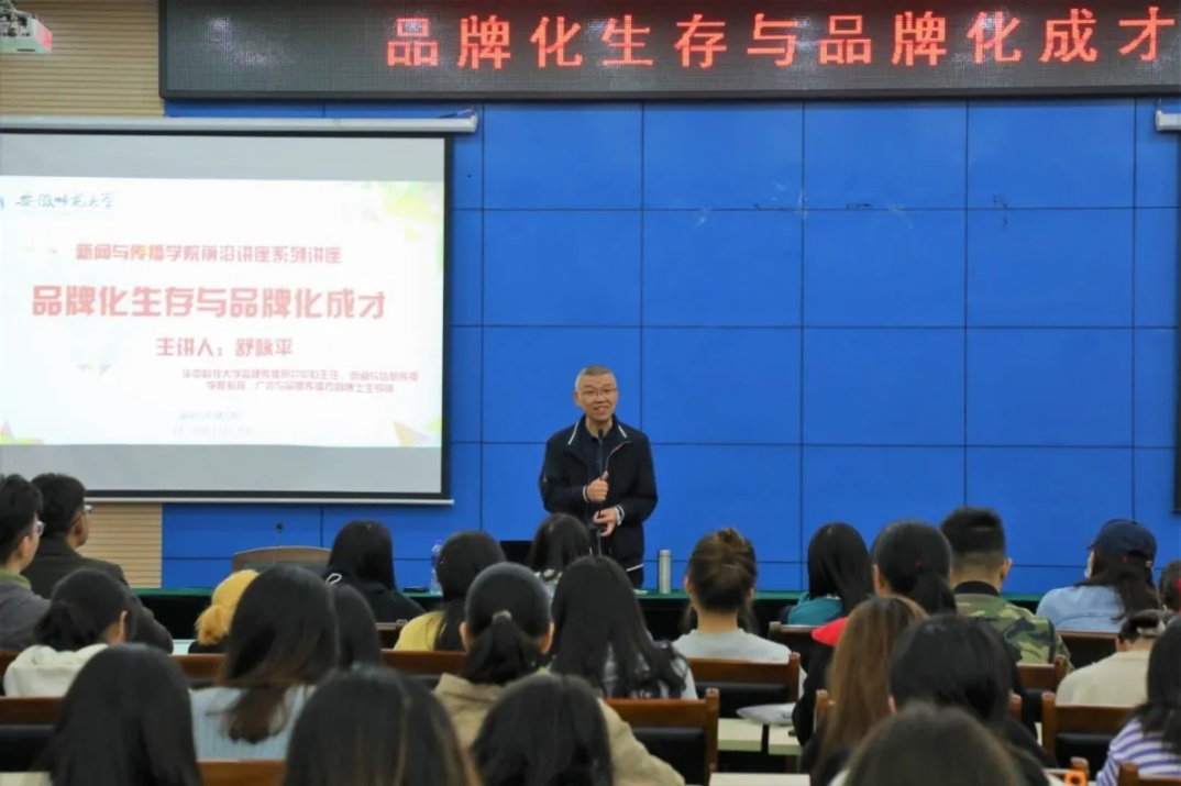 10月19日晚,我校特聘教授、华中科技大学品牌传播中心主任、博士生导师舒咏平教授应邀为我院师生开展“品牌化生存与品牌化成才”专题讲座。德赢AC米兰合作伙伴教学副院长马梅、广告系主任罗铭、辅导员刘熠以及18、19级新闻学、广告学、网络与新媒体专业学生到场聆听,活动由副院长马梅主持。