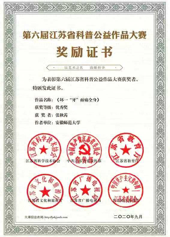 此外,2017级网络与新媒体专业的张秋芮的数据新闻作品《坏一牙而痛全身——来自牙齿的“亚健康”预警》在第六届江苏省科普公益作品大赛中荣获优秀奖。张秋芮表示,该作品的选题来源于她矫正牙齿的亲身经历,希望通过趣味可视化的形式,让更多的人了解牙齿,重视牙齿,保护牙齿。
