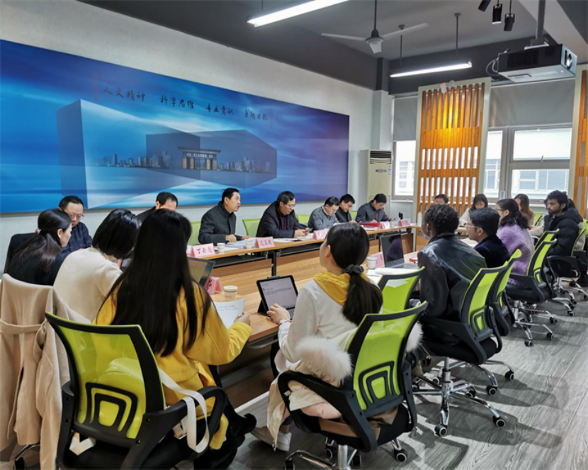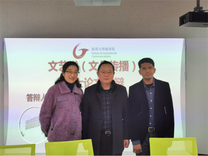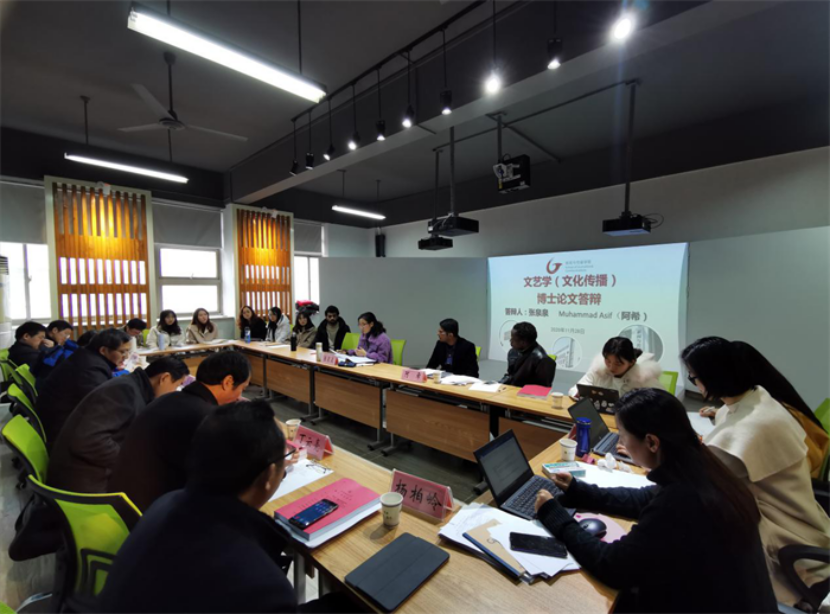 会议伊始,杨柏岭院长介绍了答辩委员会的所有成员与两位答辩人。第一位答辩人阿希(Muhammad Asif)的论文题目为“中国文艺在巴基斯坦的传播效应分析——以中巴经济走廊为考察中心”。他在探讨文化适应理论、同化理论等跨文化交际理论的基础上,通过田野调查等研究方法分析中国文化艺术在巴基斯坦的传播效应,并试图提出促进中巴文化艺术交流的有效措施。随后,答辩委员进行评议,并提出了修改意见。