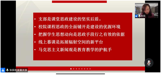 本次报告围绕课程思政融入《播音主持概论》课程教学展开。张荻老师首先介绍了当前课程思政介绍情况,表明党支部是课堂思政建设的坚实后盾,校院课程思政的全面铺开是建设的优渥环境,把握学生思想动向是思政手段行之有效的依据,线上慕课是拓展辐射空间的新平台,马克思主义新闻观是教育教学的护航手。