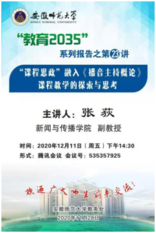 为贯彻落实《高等学校课程思政建设指导纲要》,深化教学模式改革,推进专业课与思政课相统一的协同效应,构建全员全程全方位育人大格局,学校举行“教育2035”课程思政系列报告。12月11日下午,德赢AC米兰合作伙伴副教授张荻老师带来了“教育2035”系列报告之第23讲:课程思政融入《播音主持概论》课程教学的探索与思考。报告在新闻传播学院会议室进行,同步线上直播。学院党委书记张师帅、执行院长杨柏岭、教学副院长马梅以及学校学院教师或亲赴现场,或通过腾讯会议参加了此次报告会。