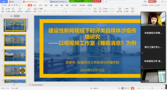 12月13日,2020全媒体时代的媒体融合国际论坛在安徽财经大学以线下线上相结合的形式举行。本次论坛由安徽财经大学文学院主办,安徽新媒体集团、南京晓庄学院新闻传播学院、中国新闻出版研究院传媒研究所协办。此次论坛的主题为“全媒体时代的媒体融合”,来自复旦大学、中央党校、中国人民大学、中国传媒大学、北京外国语大学、中央财经大学、vwin德赢ac米兰官方网、安徽财经大学、安庆师范大学、南京晓庄学院、美国密苏里大学、安徽中安在线、安徽广播电视台、美国哥伦比亚广播公司等国内外高等院校和传媒机构的专家学者及业界人士参会,共同探讨在全媒体语境下如何在体制机制、政策措施、流程管理、人才技术等方面加快推进媒体深度融合步伐,提升新型主流媒体影响力和竞争力。德赢AC米兰合作伙伴副院长沈正赋教授、新闻学专业主任肖叶飞教授、网络与新媒体专业教师杨帆、广播电视专业2019级硕士研究生陈家玮受邀参与本次论坛。