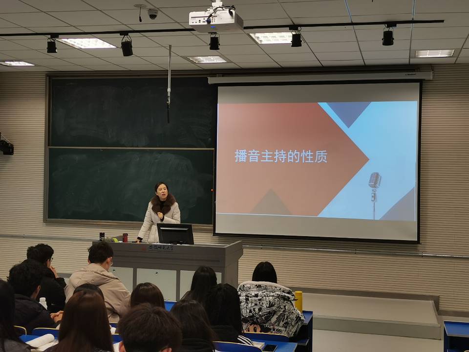 课程伊始,张荻老师首先展示了同学们课前思考题的答题情况,从同学们对于播音主持的不同认识入手引出课程的第一个概念——播音主持的多质性,对于其多质性所包含的新闻性、艺术性、语言性、技术性依次进行讲解并辅以生动案例。张荻老师还善于将课程思政元素融入教学内容里,引导学生增强民族自豪感和职业使命感。她从学生身边显而易见的“中国创造”“安徽创造”入手,使同学们对于“创造”的含义深入理解,运用现代汉语词典、心理学及书本内容解释播音主持的创造性。随后,课程回归到播音主持的主调——新闻性。播音主持在言语表达上可以体现出时效性、在情感表达上可以体现出真实性,这与新闻的时效性和真实性非常相似。张荻老师将“湖南卫视媒体战疫”及“综艺节目《蒙面唱将猜猜猜》造假丧失公信力”等案例进行对比,引起同学们对于职业责任的重视。她为同学们朗读了《播音主持委员会向奋战在疫情报道一线的播音员主持人致敬》稿件节选,在座的同学们纷纷为之感动。最后,张荻老师留下思考辩论及学科交融方面的两道课后作业供同学们思考学习。本次示范课摒弃了照本宣科、一字不落的说教的传统教学方法,整体课堂气氛活跃,师生互动愉悦而不乏专业性,这样的课是对老师教学功底与理论功底的最好体现。