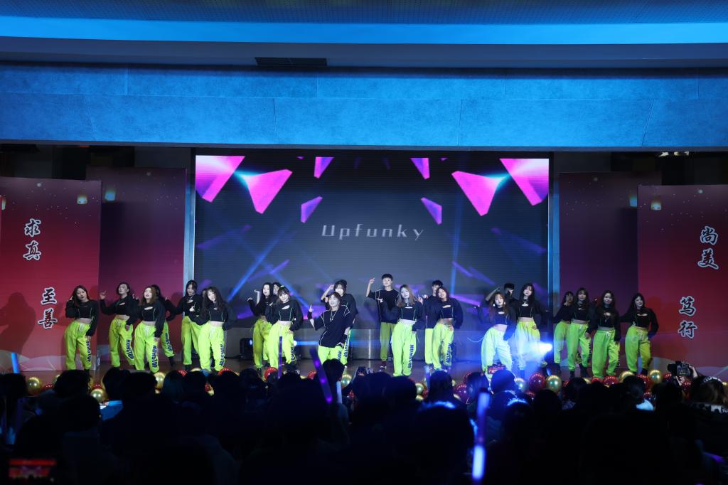 Upfunky街舞社则带来了激情澎湃的舞蹈《Nonstop Dancing》,她们整齐划一、坚定有力的动作再次带动了全场的气氛,欢呼声、尖叫声不绝于耳,再一次展示出新传学子风华正茂的青春姿态。