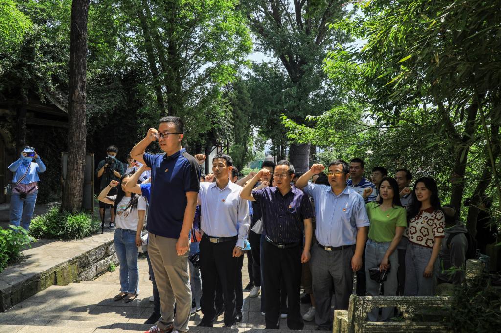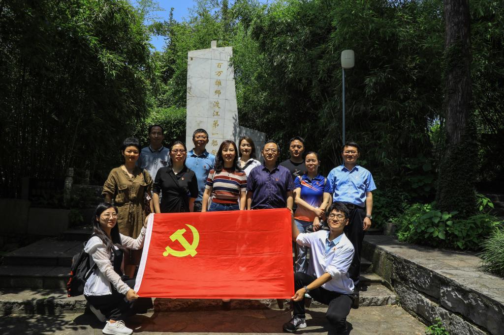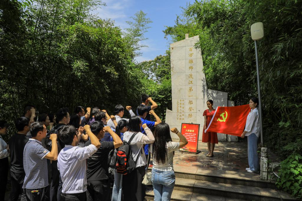 来到繁昌区荻港镇的江边,乘坐轮渡登上不远处的板子矶,“渡江第一船登陆点”纪念碑高高矗立。一段段展示珍贵文物的影像资料把人们带回到那段惊天动地、气壮山河的烽火岁月。1949年初,渡江战役全面打响前夕,在繁昌党组织和人民群众的策应下,解放军第27军先遣三名共产党员从荻港一带渡江开展侦察活动,为大军成功渡江奠定了坚实的基础。在渡江战役总前委负责人之一、中集团总指挥谭震林的直接指挥下,解放军第27军、第25军英勇奋战,以摧枯拉朽之势,飞渡长江天堑,摧毁了敌军长达千米的长江防线。大家怀着敬畏的心,听着革命先辈们作出的不朽业绩和卓越功勋,看着一件件历久弥新的珍贵展品和文献史料,无不被他们舍生取义的大无畏精神所震撼。在纪念馆旁的“百万雄师渡江第一船登陆点”纪念碑旁,党员们面向鲜红的党旗庄严宣誓,立志继承和发扬革命先辈勇于拼搏、勇于牺牲的精神。