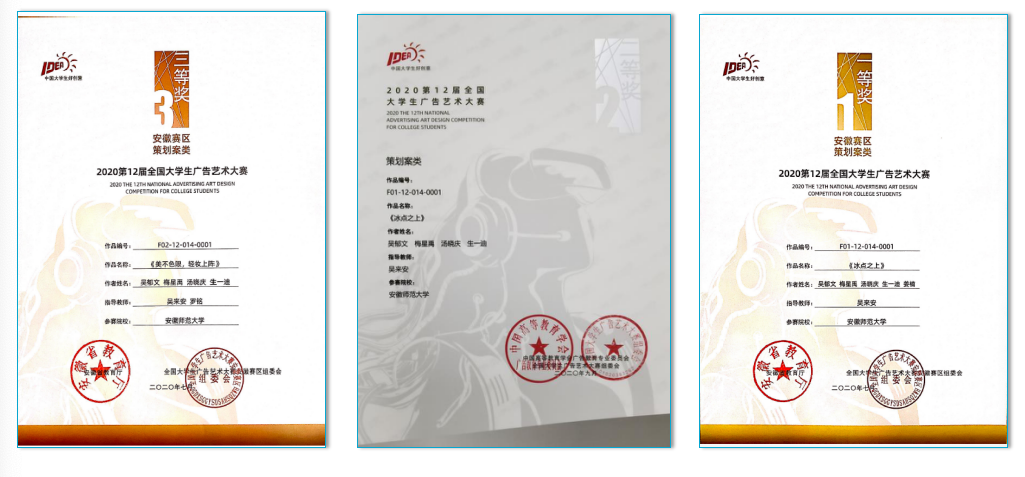 吴郁文四年本科期间,专业成绩优异。连续四年综测第一,获校一等奖学金、国家奖学金及“三好学生标兵”、“优秀学生干部标兵”等称号。她积极参加各项学科竞赛并取得丰硕成果,作为负责人带领团队获大广赛策划类国家级二等奖,曾获学院奖短视频类铜奖、全国高校廉洁公益广告作品大赛一等奖、安徽省第25届优秀广告作品大赛优秀奖等,专业竞赛累计获奖近30项。