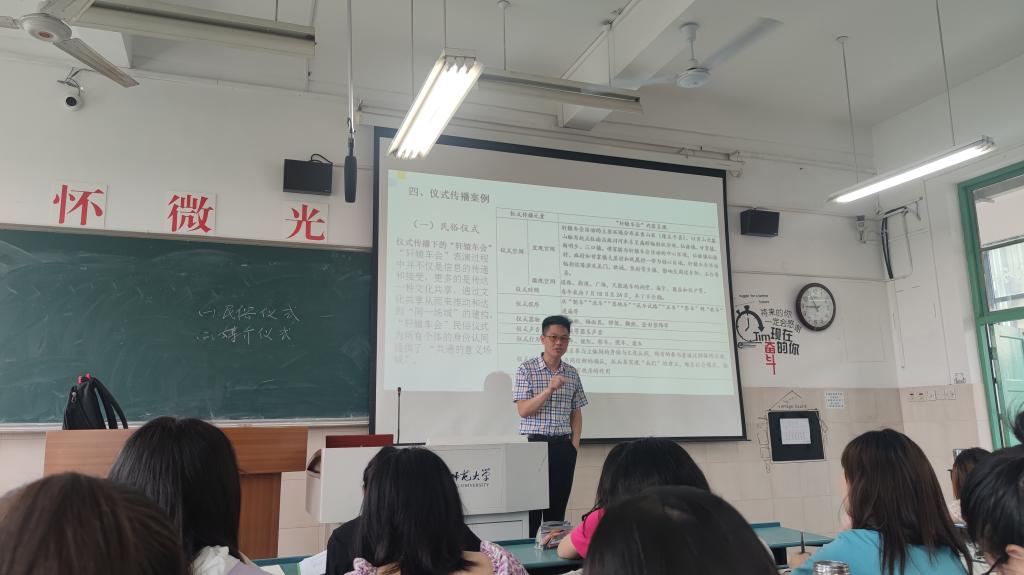 秦枫老师从“文化记忆”和“遗产”两个角度,详细阐述了这两个方面在文化与传播语境中的含义,并展示相关视频与图片,帮助同学们更好地理解文化记忆与遗产传承的互联互通。他引用詹姆斯·凯瑞和罗森布尔的相关理论知识,讲述了在数字媒介下遗产传承的现状与做法,课程讲解生动有趣,重点突出。同学们认真听讲、记下笔记并积极踊跃回答问题。秦枫老师结合课堂课外知识,一一进行解答,课堂互动氛围高涨,师生在提问中互相学习、互相提高。最后,他分享了在学习文化遗产传承时的自身做法,给予同学们一些建议和意见,鼓励同学们找到自己的学习方法,快乐学习、有效学习。