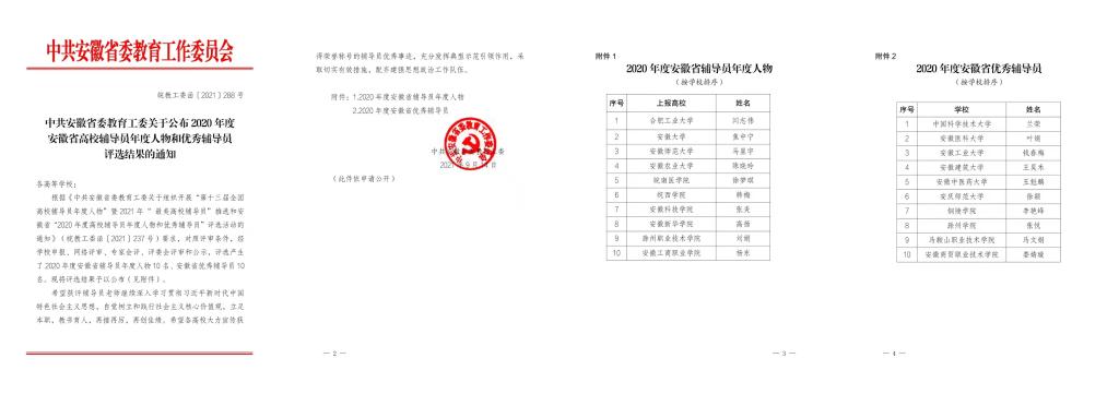近日,中共安徽省委教育工委公布了安徽省2020年度高校辅导员年度人物评选活动名单,我院马星宇老师与省内高校另外9名辅导员共同获得了安徽省年度人物称号的殊荣,这是我院继汪婕老师2013年获得安徽省高校辅导员年度人物之后再次获得年度人物称号。