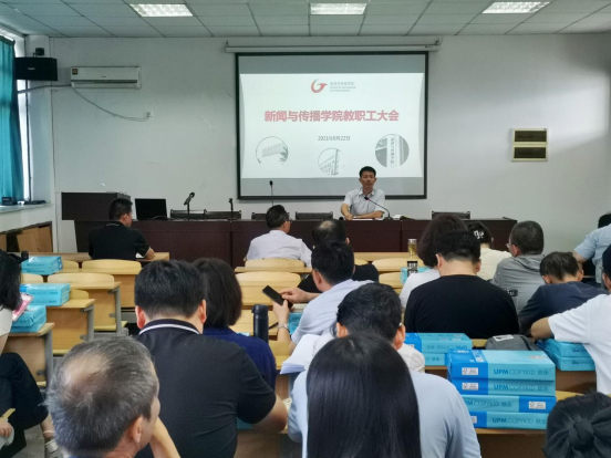 部校共建副院长马梅介绍了新学期的学者讲座、学术交流计划;学院与新安晚报、芜湖传媒中心等单位续签实习,就业协议,加强与各单位之间的合作;同时鼓励教师线上线下混合教学、使用学习通投屏教学等。