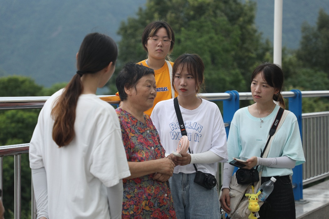 (图为朱梦婕、余仁洁在梅山水库大坝上采访红军后代秦立英老人)
