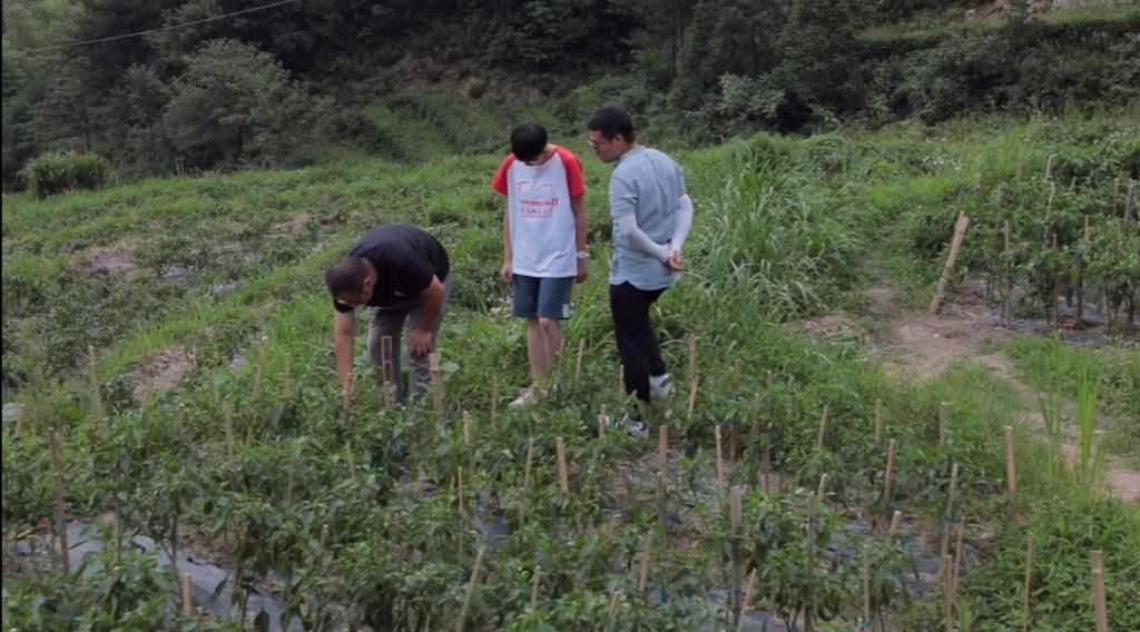 (图为刘紫仪与指导老师马星宇在岳西县主簿镇余畈村跟随村民参观辣椒田地)