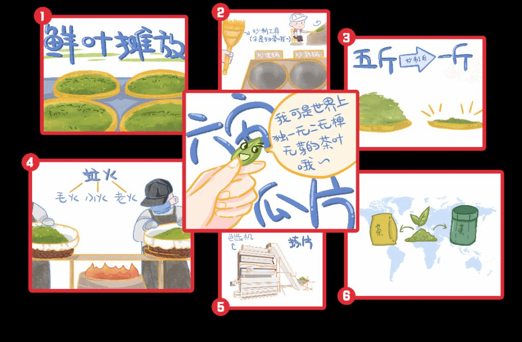 (图为由吴哨童等团队新闻专业同学策划、采访后形成的漫画六安瓜片制作流程)