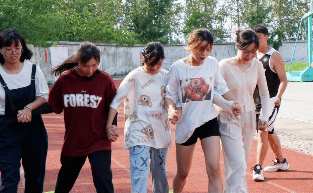 (图为程子情、董依萌和支教学校的同学们一起参加“五人四足”项目)