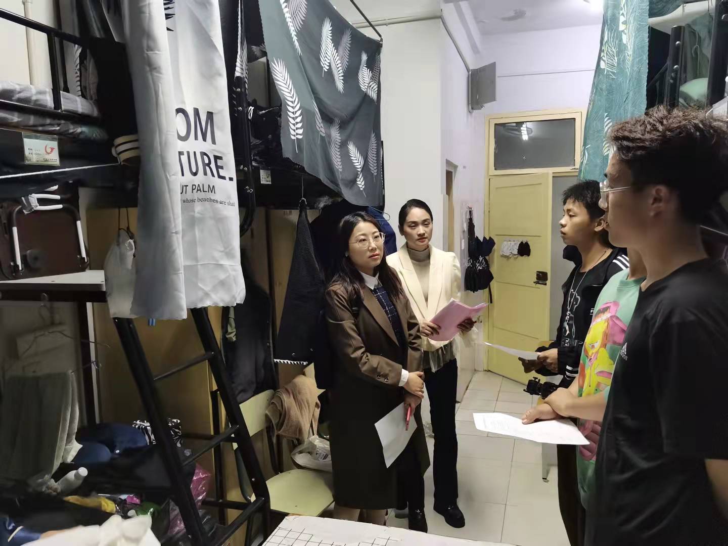 本次重点就宿舍的安全、卫生与寝室氛围进行检查。每间宿舍张雁和俞应芬都着重强调不可使用违规违禁电器、及时掐断电源,安全问题必须落实到每一个细节,不可以私接电线,倡导大家要增强安全防范意识,提高自我保护意识与能力,注意人身与财产安全。在查访过程中,老师们鼓励同学们努力提升寝室文化,结合即将到来的寝室设计大赛进行寝室文化创建。宿舍整体卫生干净、无违禁物品的行为,寝室氛围较为融洽。