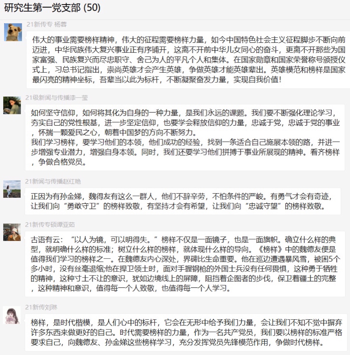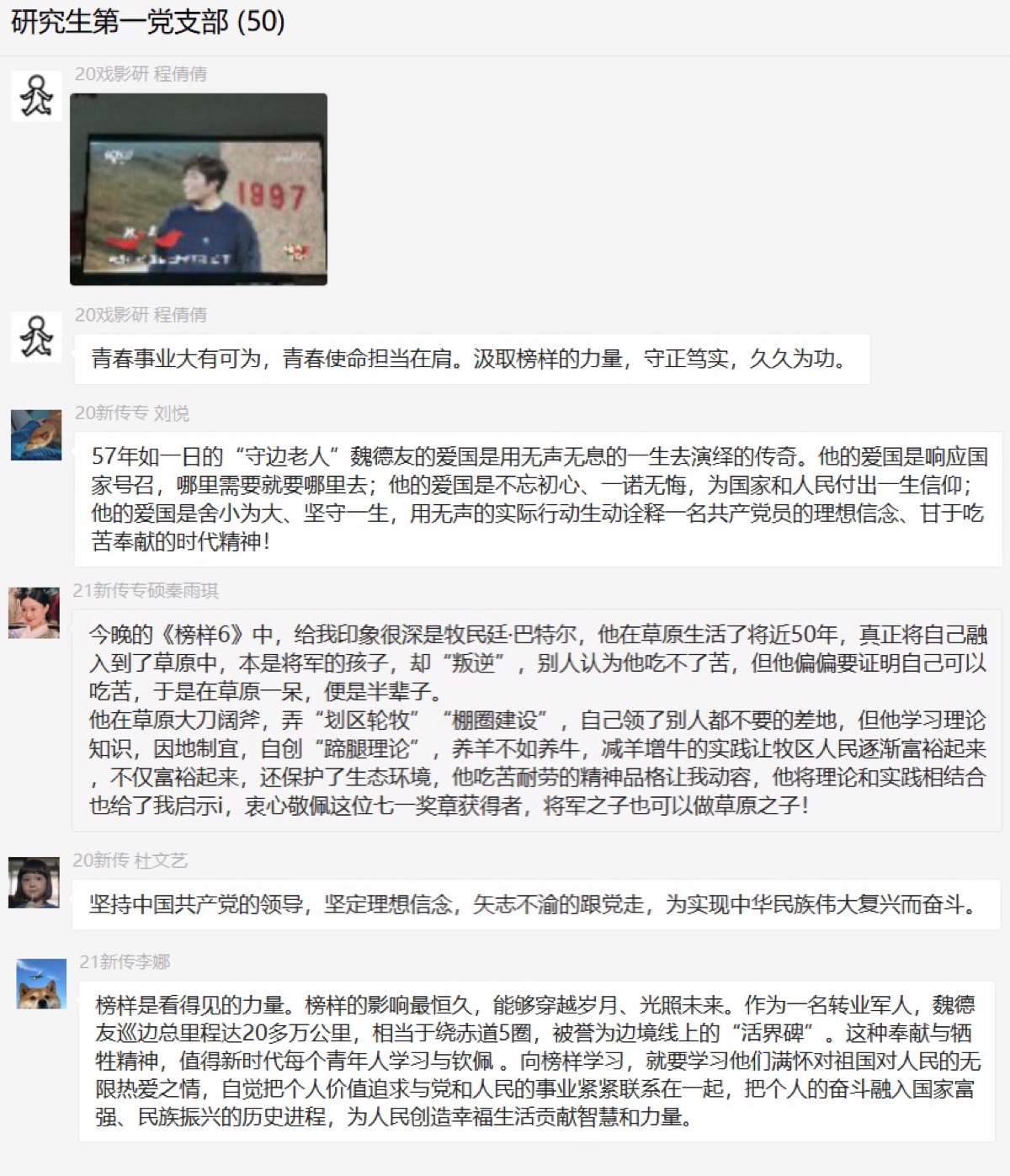 在观看《榜样6》后,同学们纷纷表达学习体会与感想。支部宣传委员刘悦同学说:“57年如一日的“守边老人”魏德友的爱国是用平凡的一生演绎的传奇。他的爱国是响应国家号召,哪里需要就到哪里去;他的爱国是不忘初心、一诺无悔,为国家和人民付出一生信仰;他的爱国是舍小为大、坚守一生,用无声的实际行动生动诠释一名共产党员的理想信念、甘于吃苦奉献的时代精神!”王海玲同学表示:“榜样有着无穷的力量,向下扎根,朝上生长,榜样最能温暖人、启迪人。作为新时代的青年共产党员,作为vwin德赢ac米兰官方网德赢AC米兰合作伙伴的研究生,我们会不忘初心,勇于奉献,甘于奉献,承担起中华民族伟大复兴的使命。要向榜样人物学习,比如卫国戍边英雄团长祁发宝,在与越线外军的斗争中,身先士卒,身负重伤,坚守祖国的每一寸国土,让人动容;从“将军之子”到“草原之子”,在最穷最偏远的牧区扎根,带领乡亲们共同致富的“七一勋章”获得者,有“草原之子”之称的廷·巴特尔令人敬佩……优秀人物就是我们学习的榜样,是激发我们前进的动力!”张云同学认为:“时代前进需要积极向上的道德风尚来引领,社会发展需要道德楷模的力量来推动。他们的高尚品德,温暖了人心,感动了中国,为全社会树立了榜样。魏德友便是我们的榜样之一。在平凡而又伟大的53年里,魏德友始终不忘初心,坚持为国戍边信念,与妻子一起驻守在夏季蚊虫肆虐、冬季风雪埋人的无人区,过着‘家住路尽头,放牧为巡边’的生活,书写了西陲戍边半世纪。在实现中华民族伟大复兴中国梦的征途中,我们会向时代楷模看齐,永不言弃!”杨韵箫同学说:“孙金娣、魏得友等人作为基层模范先锋代表,已经将党员的先锋模范作用不断发扬光大,他们就是我们的榜样,我们要追的星。中国共产党的初心和使命,就是为中国人民谋幸福,为中华民族谋复兴。这个初心和使命是激励中国共产党人不断前进的根本动力。全党同志一定要永远与人民同呼吸、共命运、心连心,永远把人民对美好生活的向往作为奋斗目标,以永不懈怠的精神状态和一往无前的奋斗姿态,继续朝着实现中华民族伟大复兴的宏伟目标奋勇前进……”周晓庆同学表示:“观看《榜样》,学习优秀共产党员的先进事迹,以强烈的标杆意识,以榜样为鉴,学榜样,向榜样看齐。‘动人以言者,其感不深;动人以行者,其应必速。’《榜样》中每一个镜头、每一个场景、每一个故事,都彰显着党员的力量,展示着党员的魅力,传递着党员的正能量,让观看的人都深深地感动、折服,用平凡故事讲述深刻道理,用先进典型模范事迹诠释党的崇高理想,展现了一代又一代共产党人不忘初心的执着和坚守。”