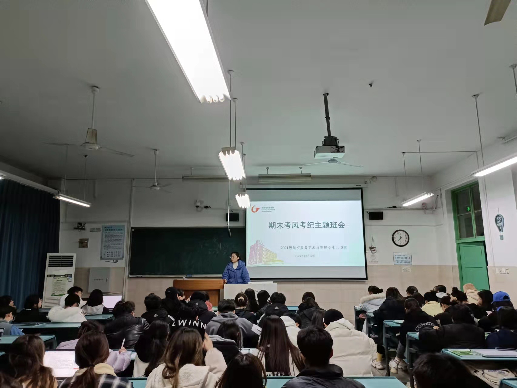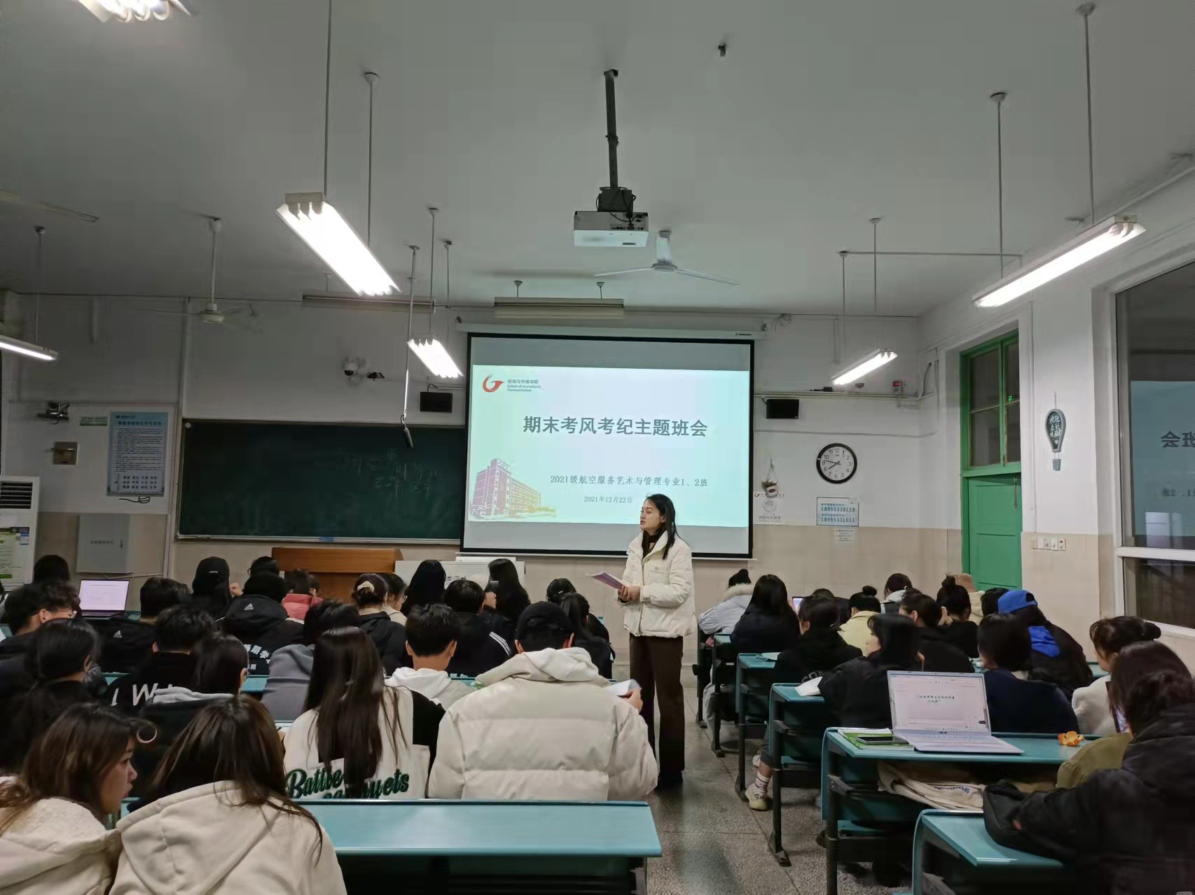 本网讯(文/万云龙 图/李鑫鑫)12月22日,21级航服1、2班在2050504教室召开期末考纪考风主题班会,辅导员张雁老师主持,生活辅导员俞应芬及全体同学参会。