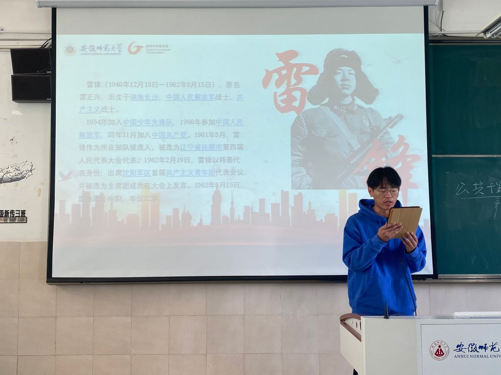 视频播放结束后,团支书刘皖蒙做总结发言。他表示,“雷锋”,世人皆知的名字,“雷锋”,世人敬佩的名字,是我们所有中华儿女共同的回忆。“雷锋”,其实从未离我们而去,他的精神激励着一代又一代中国人自强不息、奋勇向前,他的信念引领着一代又一代中国人守望相助、砥砺前行。希望新一代青年可以继续传承雷锋精神、争做时代先锋,为祖国的繁荣发展做出贡献。